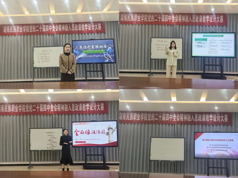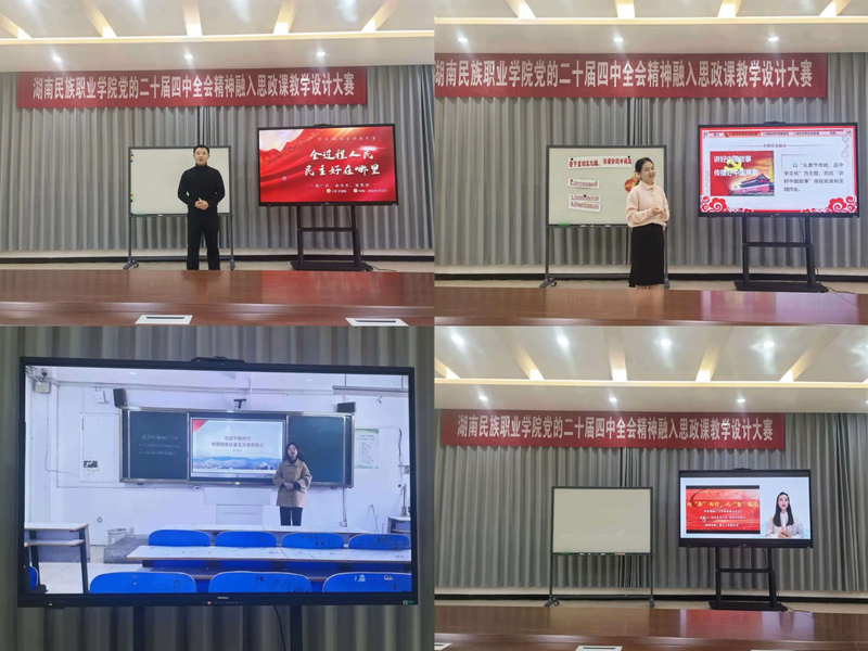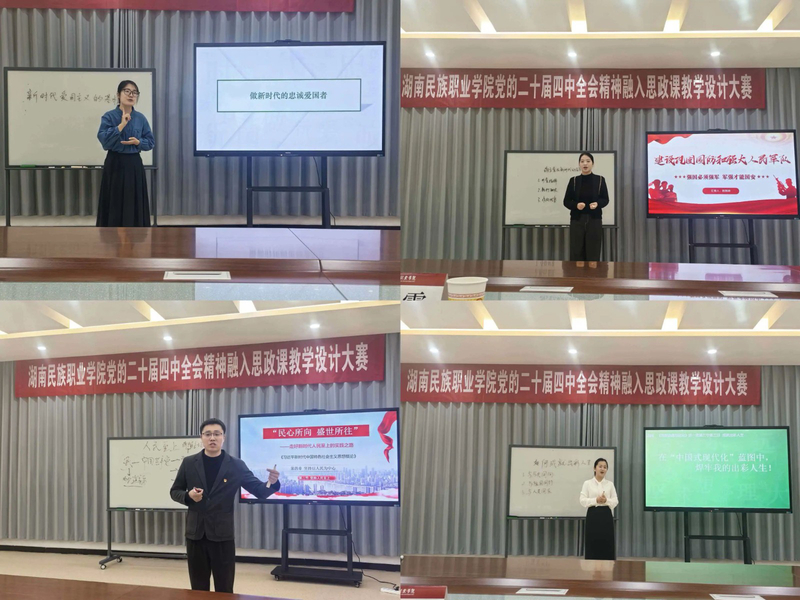 近日,湖南民族职业学院在可桢楼204会议室举办党的二十届四中全会精神融入思政课教学设计大赛决赛。学校党委书记刘朝晖、副校长王永等校领导出席活动,并特邀湖南铁道职业技术学院贺彩霞、长沙民政职业技术学院马也名、重庆城市管理职业学院马璨三位全国高校思想政治理论课教学展示活动特等奖获得者担任评委。马克思主义学院全体教师到场观摩。